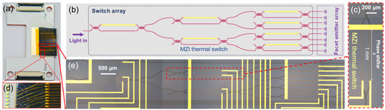 The device was fabricated on a SNOI wafer with a 300 nm thick device layer and a 4.4 µm thick buried oxide layer. To define the device structures, electron-beam lithography (EBL) with ARP 6200 resist was used, followed by reactive ion etching (RIE) for pattern transfer. A 2.9 µm SiO2 layer was deposited using inductively coupled plasma chemical vapor deposition (ICP-CVD) and the sample was planarized and thinned to 2.4 µm with IC1-200 dielectric material. A dry etching process was then applied for optical and electrical optimization. A 200 nm thick titanium (Ti) layer and a 10 nm thick gold (Au) layer were deposited by electron beam evaporation to form the heater for thermal phase tuning, followed by the deposition of a 300 nm thick Au layer for the formation of contact wires and pads. The chip, sized at 12 mm × 1 mm, is mounted on a copper substrate with PCBs wire-bonded to the on-chip electrodes to supply power from a voltage source, as shown in Figure 2a,d. A microscope image of the fabricated device is shown in Figure 2e. As shown in Figure 2b, the FPA device integrates two key components: a switch array and a facet emitter array. The switch array comprises seven MZI thermal switches, each incorporating two 2 × 2 MMIs and a phase shifter. As detailed in Figure 2a, the phase shifter has a length of 1 mm.