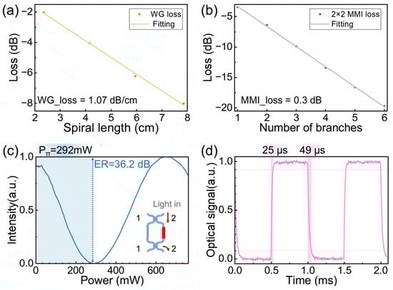 The single thermally tunable MZI consists of two 2 × 2 MMIs and two waveguide arms, with the multimode interference region of each 2 × 2 MMI measuring 110 × 14 µm2. Figure 3b presents the excess loss measurement of six cascaded 2 × 2 MMIs, where linear fitting reveals a per-MMI excess loss of 0.3 dB. The x- and y-axes correspond to the number of cascaded stages and the measured optical loss, respectively. It is important to note that a 2 × 2 MMI inherently introduces a 3 dB loss, a result of the self-imaging principle.