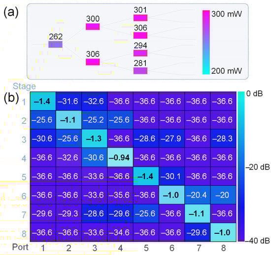 The phase shifters were adjusted at each stage to facilitate light propagation from port1 to port8. Figure 4a shows the half-wave power of each phase shifter, ranging from 262 mW to 306 mW. The half-wave power of each phase shifter was individually measured to serve as the reference value for precise phase control. The light was fully directed to only one output port under the precise phase control, while the optical intensity of the other output ports was simultaneously measured using lensed fibers and photodetectors. As shown in Figure 4b, the excess losses of the device were greater than or equal to −1.4 dB at each port, while the losses at other ports in the same stage ranged from −20 dB to −36.6 dB. The device exhibited an extinction ratio of approximately 19 dB, which was attributed to the spectral ratio of the 2 × 2 MMI. The excess losses showed a fluctuation of less than 0.5 dB, primarily due to metal absorption losses on the chip surface.
