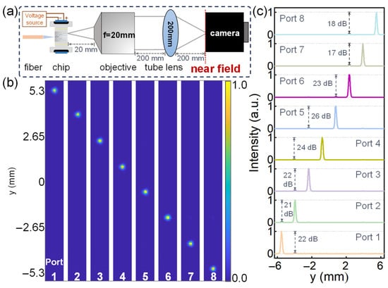 Figure 5b shows the reconfigurable near-field light patterns. The near-field light patterns have a total length of 10.6 mm, with a pitch of 0.88 mm between adjacent patterns. These patterns, ranging from port1 to port8, were generated by applying different power configurations to the phase shifters of the MZI switch array. Only one output port emits light at a time, while the other ports remain in a state with no light emission. It is clearly observed that all patterns exhibit a clean background, indicating that leakage light from non-operating emitters is negligible. The background suppression of port8 and port7 was measured at 17 dB and 18 dB, respectively, with the suppression in other ports exceeding 20 dB, as shown in Figure 5c.