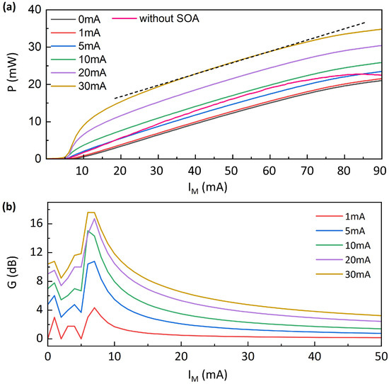 (a) Measured P–I characteristics in continuous wave mode of the DML with and without SOA. (b) Power gain of the DML with SOA measured under different currents .