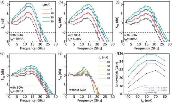 (a–d) Frequency response of the fabricated DML under different and : (a) mA; (b) mA; (c) mA; (d) mA; (e) frequency response of the DML without SOA at different ; (f) summary of laser bandwidth.