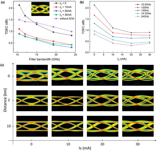It should be noted that, in theory, the dynamic gain response of the SOA may introduce a certain degree of chirp. However, in our experiments, no significant performance degradation attributable to chirp was observed. As shown in Figure 6b, the TDEC value continuously decreases with increasing SOA bias current, and the eye diagram in Figure 6c also exhibits a clear improvement in opening. These results indicate that the overall signal quality is effectively enhanced. Therefore, under the current device structure and bias conditions, the output power gain and signal amplification provided by the SOA play a dominant role in performance improvement. The positive effect of increasing the signal-to-noise ratio (SNR) clearly outweighs the potential negative impact of chirp.
