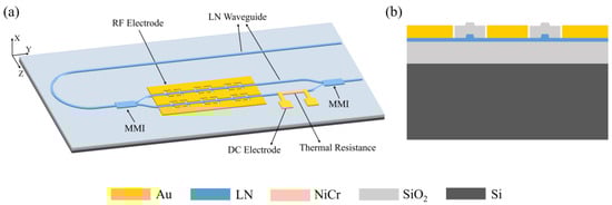 The overall design of the broadband modulator is illustrated in Figure 1a. The optical section employs the classic Mach–Zehnder structure: An optical carrier is equally divided into two beams by a multimode interference coupler (MMI), which then propagates through two modulation arms. After passing through the E-O modulation region, they are combined again by another MMI. The input and output of the optical carrier are located on the same side, enabling a higher integration density and suitability for applications in multi-channel modulator arrays and modules. RF signals are transmitted in the RF electrode loaded with an SWS, and the electric field is concentrated in the gaps where the optical waveguide is located, enabling efficient E-O modulation. A nickel–chromium (NiCr) alloy thermal resistor is placed near the modulation arm, and it is powered by a DC-bias electrode to generate Joule heat. Through the thermo-optical effect, a more compact device size and more stable bias control can be achieved [21]. Figure 1b shows the cross-sectional structure of the E-O modulation region. The substrate is high-resistivity silicon, and the E-O crystal layer is TFLN with a thickness of 600 nm. The buried oxide layer has a thickness of 4.7 μm. The ridge waveguides are formed by etching the TFLN layer, and the height of the ridges is 300 nm. The RF electrode loaded with the SWS (slow-wave electrode) is fabricated from gold and deposited on the slab of TFLN after etching in the E-O modulation region. The thickness of the electrode simultaneously affects the RF characteristics and modulation efficiency of the device. Based on the simulation analysis, it can be concluded that both the transmission loss and characteristic impedance of the CPW decrease with an increase in the conductor thickness. The characteristic impedance exhibits a gradual progression with an increase in the conductor thickness, and the transmission loss approaches a plateau when the thickness exceeds 800 nm. However, the overlap area between the electric field and optical field should be maximized to enhance the modulation efficiency of the device; thus, the conductor thickness cannot be excessive for a 300 nm high LN ridge waveguide. Finally, the electrode thickness is determined to be 900 nm.