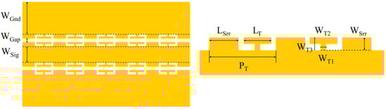 Figure 2 shows the schematic structure of the slow-wave electrode. In order to minimize the ohmic loss, the signal line width (WSig) is 20 μm before loading the SWS, while the ground line width (WGnd) is 180 μm. Periodically arranged square serrations and T-shaped stubs extend from the sides of the signal line and the ground lines. The width of the square serration WSrr is equal to the sum of the WT2 and WT3, which is the total width of the stub. The sum of the serration length LSrr and the stub length LT is a constant value close to the period length PT. Consequently, new conductor gaps are formed between the slow-wave structures. The modulation efficiency of the device increases as the conductor gap width WGap decreases, while the RF transmission loss simultaneously rises. Moreover, an excessively small WGap would induce strong metal absorption and significant optical attenuation. For TFLN modulators, the gap width of the electrode typically ranges between 5 and 7 μm. Comprehensively considering the fabrication quality combined with broadband performance requirements, WGap is preferentially selected as 7 μm. The cut-off frequency fc of the first passband in a periodically loaded transmission line is given by Equation (1), where Ls and Cs, respectively, represent the lumped inductance and capacitance per unit period, approximately correlated with PT. A larger PT would result in a lower fc, thereby limiting the device’s high-frequency performance. Furthermore, since the gaps between adjacent SWSs may weaken the E-O interaction in those regions, the total length of the SWS (LSrr + LT) within each period should be maximized to approach the PT as closely as the fabrication tolerances permit. Therefore, they are set to PT = 50 μm and LSrr + LT = 45 μm in this design. Moreover, WT1, WT2, and WT3 are set to the minimum processable length of 2 μm (WSrr is 4 μm) in order to make the stubs more tunable and the electrode more compact, simultaneously. The length of the complete slow-wave electrode in the E-O modulation region is 8 mm to balance the RF loss and the half-wave voltage.