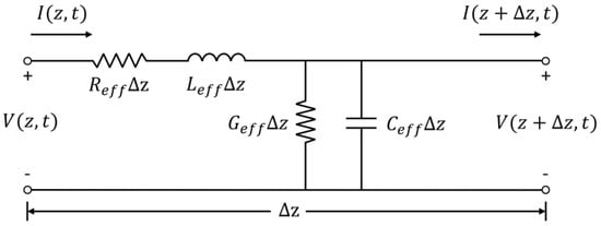 According to the transmission line theory [22], the electrical characteristics of a TWE can be analyzed and characterized through a distributed-parameters network in the millimeter-wave band. As a non-uniform transmission line, a slow-wave electrode lacks inherent distributed parameters due to its spatially varying geometrical dimensions and heterogeneous structural configurations along the signal propagation axis. However, since the dimensions and the periodic length of the loaded SWS are significantly smaller than the millimeter-wave wavelength, the slow-wave electrode can still be approximately regarded as a uniform transmission line with effective electromagnetic properties [23]. Figure 3 shows the equivalent circuit model of a slow-wave electrode per unit length (), where Reff, Leff, Geff, and Ceff represent the effective distributed resistance, inductance, conductance, and capacitance, respectively. Under the high-frequency and low-loss approximation, the nRF and effective characteristic impedance Zeff of slow-wave electrodes can be expressed by Equation (2).