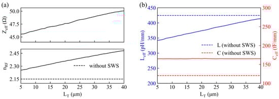 where vRF is the phase velocity of the RF signals, β is the phase constant of the electrode, f is the RF frequency, ω is the angular frequency, φ (in radians) is the phase shift of the RF signals at each frequency, and L is the phase shift length. Figure 4a shows the simulated Zeff and nRF of the electrode corresponding to different values of LT. As the LT increases from 5 μm to 40 μm, the Zeff gradually increases from 45 Ω to 50 Ω. Meanwhile, the nRF of the slow-wave electrodes increases from 2.238 to 2.496 and is always greater than the nRF of the regular electrode without an SWS, which is 2.14. The Leff and Ceff can be calculated by Equation (4) and are shown in Figure 4b. Compared with the regular electrode, the Ceff increases significantly from 120.7 fF/mm to approximately 165 fF/mm, while the Leff decreases correspondingly with the length of the SWS. This is because the square serrations can be regarded as shunt inductors, which play a role in reducing the distributed inductance of the transmission line. When the LT increases (and the LSrr decreases), the Ceff stabilizes, while the Leff exhibits linear growth and approaches the distributed inductance of the regular electrode, which is 424.6 pH/mm. The fc of the designed slow-wave electrode can be approximately calculated to be 800 GHz with Equation (1), where Ls ≈ PTLeff and Cs ≈ PTCeff. This indicates that the slow-wave electrodes possess a sufficiently wide passband to support the transmission of RF signals.