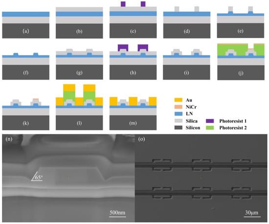 The modulator chips were fabricated on X-cut LNOI wafers (NANOLN), and the fabrication processes are shown in Figure 5a–m. All the patterning processes were performed using traditional ultraviolet (UV) lithography. This enabled us to pattern the structure at a faster speed and lower cost compared with electron-beam lithography (EBL) while maintaining good alignment accuracy. A thick silica layer was used as the hard mask for the TFLN layer. After patterning, the LiNbO3 ridge waveguides were fabricated by inductively coupled plasma reactive-ion etching (ICP-RIE) with an etching depth of 300 nm. After removing the remaining mask with the buffered oxide etch (BOE) solution, a silica buffer layer with a thickness of 900 nm was deposited again on the entire chip. The buffer could both confine the optical carrier within the LiNbO3 waveguide and prevent severe optical loss caused by metal absorption in the area where the electrode overlapped with the waveguide. Subsequently, the buffer in the E-O modulation region was removed through ultraviolet lithography and dry etching. Most of the lattice defects introduced by previous etching processes were removed through annealing, which could reduce the on-chip optical loss. The NiCr thermal resistance near the ridge waveguide was fabricated by ultraviolet lithography, electron-beam evaporation, and the lift-off process. The gold electrode co-loaded with square serrations and T-shaped stubs was prepared in the same way. It should be clarified that Figure 5l,m show the fabrication process of slow-wave electrodes within the modulation region, and the NiCr resistor shown in Figure 5j,k was fabricated outside the region, but it was securely clamped by the gold DC electrode to establish the electrical connectivity shown in Figure 1a. Figure 5n,o present the TFLN ridge waveguide and slow-wave structures photographed under a scanning electron microscope, respectively. The ridge waveguide with smooth sidewalls had a width of 1.5 μm and an inclination angle of 65°. The serrations and stubs on the electrode feature precise dimensions and a well-defined morphology.