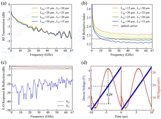 Finally, a modulator with an SWS of LSrr = 25 μm and LT = 20 μm was selected and coupled with a dual-channel fiber array (FA) for E-O response measurements at 1550 nm. An external 50-Ω-terminator was connected at the end of the RF electrode to absorb electromagnetic energy and prevent signal reflection. The normalized E-O response and electrode reflection of the modulator is shown in Figure 6c. Within the range of 0.01–67 GHz, the S11-power reflection curve remains below −12 dB, which indicates that the impedance of the device was well-matched with the external RF system. The E-O bandwidth of modulators is typically defined as the frequency at which the E-O response rolls off by 3 dB from its low-frequency value in engineering. Accordingly, the E-O bandwidth of this modulator chip far exceeds 67 GHz, since most of the S21-power transmission curve is above −2 dB, except for a dip at 60.5–62 GHz, which reaches −2.5 dB. It should be emphasized that the dip is introduced by external factors of the chip and does not disrupt the gentle downward trend of the curve.