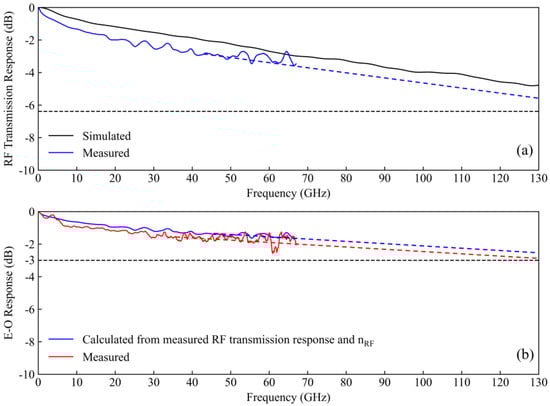 (a) Simulated RF transmission response within 0–130 GHz and measured RF transmission response within 0.01–67 GHz. The measured curve is extrapolated to 130 GHz, and both curves are normalized. (b) E-O response calculated from measured RF transmission response and nRF, along with the measured E-O response. The curves are both within 0.01–67 GHz and extrapolated to 130 GHz.