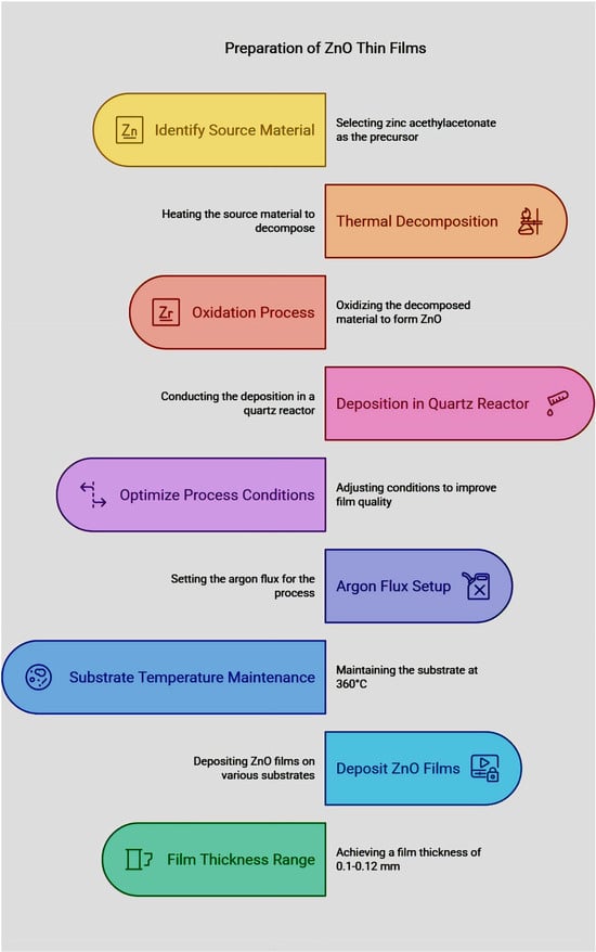 Chemical Vapor Deposition (CVD) is a common method of synthesizing high-quality ZnO thin films with a controlled thickness, composition, and crystalline structures. CVD is widely used in semiconductor and optoelectronic devices, such as thin-film transistors, gas sensors, and transparent conductive oxides. The process of CVD for ZnO thin film deposition involves several steps that facilitate uniform growth and optimal material properties, as shown in Figure 2.