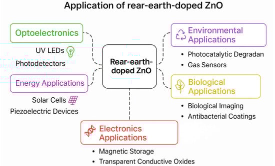 Remarkable advancements have shown the effectiveness of rare-earth-doped ZnO in photonic and sensing applications. For example, Europium (Eu)-doped ZnO shows an enhanced UV sensitivity, making it an exceptional material for high-performance photodetectors [20]. Similarly, Terbium (Tb) doping has allowed for the development of efficient green-emitting LEDs, leveraging its strong luminescence properties [21]. Prior to optoelectronics, rare-earth-doped ZnO has gained interest in catalysis, energy storage, and biomedical applications. The combination of Gadolinium (Gd) and Dysprosium (Dy) induces long-range ferromagnetic ordering, positioning ZnO as a viable candidate for spintronics, quantum computing, and high-density magnetic storage devices [12,22]. In addition, the medical field has examined rare-earth-doped ZnO for bioimaging and medical diagnostics, using its luminescent contrast properties for advanced imaging techniques [9]. Although significant progress has been made, further studies are essential to unravel the mechanisms governing dopant-induced defect states, charge carrier recombination, and band structure modulation. Focusing these elemental aspects will be crucial for realizing the full potential of rare-earth-doped ZnO in future technological and industrial applications [18,19].