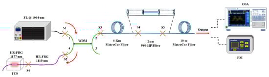 Arm 2 is fusion spliced (S3) to 4 Km Corning MetroCor fiber, then to 2 cm Nufern 980-HP fiber (S4), and finally spliced to 10 m fiber Corning MetroCor (S5). The Nufern 980-HP optical fiber has an effective area of ~18 μm2, while the Corning MetroCor optical fiber has an effective area of ~40 μm2, introducing core discontinuities that enhance nonlinear interactions. Arm 4 is connected to two FBGs: FBG 1119 nm via splice S2 and FBG 1177 nm via splice S6, with a separation of 1 m between the FBGs. All splice losses are ~0.01 dB. When 4.3 W of pump power is coupled into Arm 2, the SRS is initiated in the 4 Km Corning MetroCor optical fiber, generating Stokes emissions near 1121 nm and 1178 nm, as previously reported []. Meanwhile, ~4.6% propagation of pump power through Arm 4 allowed the FBGs to reflect light at their Bragg wavelengths. A Fresnel reflection (~4%) at the end of FBG-1177 nm, due to the air–glass interface, provided additional feedback, allowing distributed feedback Raman lasing by coupling back into the gain medium, stimulating the population of glass molecules excited at the virtual level to emit photons with the same characteristics as the Bragg wavelengths, thus achieving SRS or Stokes.