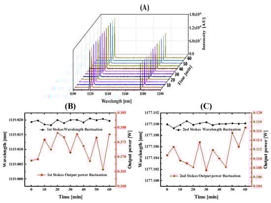 (A) Output spectrum measured at room temperature recorded every 5 min. (B) Output power and laser wavelength variations corresponding to the 1st Stokes and (C) output power and laser wavelength variations corresponding to the 2nd Stokes.