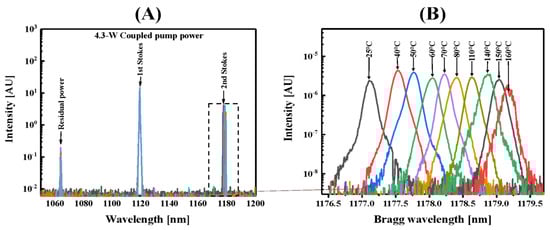 (A) Representative output spectra for various temperatures considered in the experiment. (B) Shows the shift in the output intensity profile in arbitrary units (AU) of the 2nd Stokes when an increase in temperature is applied to FBG-1177 nm.