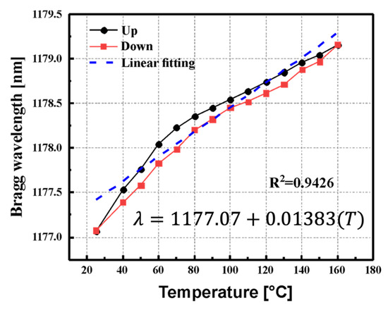Figure 5 shows the Bragg wavelength shift for the FBG-1177 nm as temperature increased from 26 °C to 160 °C and back. A shift of approximately 2.02 nm is measured, corresponding to a thermal sensitivity of 15.07 pm/°C. A hysteresis of ~0.24 nm is observed when the temperature decreases. It is important to recall that the wavelength shift generated by the FBG is related to the thermal expansion coefficient (0.55 × 10−6/°C) and the thermo-optic coefficient (8.6 × 10−6/°C) of silica optical fiber []. In addition, these fibers can withstand significant thermal variations without damage [].