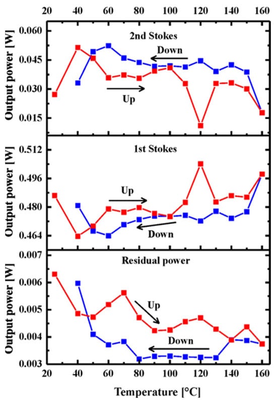 The power distribution among the residual pump, 1st Stokes, and 2nd Stokes is analyzed (Figure 6). A power exchange behavior is observed: as the 2nd Stokes power dropped at 120 °C, the 1st Stokes power increased, suggesting energy redistribution between orders. For example, at 120 °C, the 2nd Stokes transfers power to the 1st Stokes. Across all of the spectral measurements taken during this study, the output power of the laser system consistently maintained a value of 0.53 W. The detailed breakdown of this output power, illustrating its distribution among the unabsorbed pump light (residual pump), the first-order Stokes emission, and the second-order Stokes emission, is clearly depicted in Figure 6. This figure provides a visual representation of how the total output power is partitioned across these different spectral components.