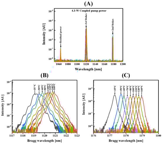 The dual laser emission generated by the Raman fiber laser is shown in Figure 2A. Here, it can be appreciated that the emissions are centered at the Bragg wavelengths. Moreover, the laser spectra were recorded every five minutes for an hour, and the stability of the output power and wavelength of the Stokes signals can be observed in Figure 2B,C; this study is carried out at room temperature. These results show that the output power variations are ~0.02 W for the 1st Stokes and ~0.01 W for the 2nd Stokes. Concerning the wavelength at room temperature, the results for the 1st and 2nd Stokes show minimal variations; see Figure 2B,C.