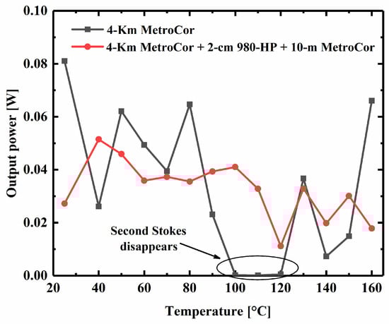 The discontinuity of the core of the Raman gain medium optimizes the output power as shown in Figure 8, this exhibits two output power curves for the second Stokes with and without Nufern 980-HP fiber segment, these curves were obtained at 4.3 W, a safety pump power limit to protect the WDM itself, because our WDM is limited to 5 W of pump power. Note that the output power curve without the Nufern 980-HP fiber segment fluctuates and even disappears in the 100–120 °C range. However, if we apply power above 4.3 W, the second Stokes curve is fully visible. By inserting the short segment of Nufern 980-HP fiber, the difference in effective area allows for superposition of the fundamental modes of pump power at 1064 nm and the first and second Stokes power at 1119 and 1177 nm [], respectively.
