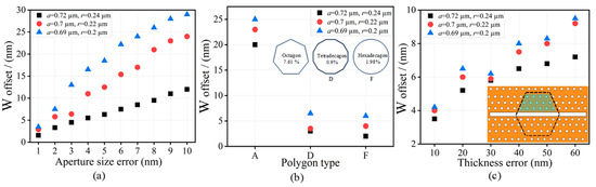 (a) Correlations between resonant wavelength shifts and air-hole radius deviations. (b) Regular polygonal apertures (showing their roundness) and correlations between resonant wavelength shifts and roundness distortions. (c) Thickness variation types within the PhC optical cavity and correlations between resonant wavelength shifts and thickness variations.