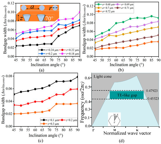 The PhC slab designed in this study is based on an LN platform. The inset in Figure 3a illustrates the PhC slab prototype with defined structural parameters, where a represents the lattice constant, r denotes the radius of the air holes, and z indicates the thickness. Additionally, the inclination angle of the structure is denoted as (°). Figure 3a also presents the normalized bandgap width, /, where is the bandgap width and is the center frequency of the bandgap. The normalized bandgap width is calculated relative to . Our investigation focused on the influence of the inclination angle on key structural parameters, including a, r, and z. We observed that the inclination angle significantly affects the bandgap width. As the r decreases, the bandgap width increases, in correlation with the inclination angle, as shown in Figure 3a. Specifically, the bandgap width decreases with decreasing inclination angle. As the a increased, the bandgap width decreased in correlation with the inclination angle, as shown in Figure 3b. Furthermore, notable variations in the bandgap width were observed for different inclination angles and z, as illustrated in Figure 3c. These results demonstrate that as the inclination angle decreases from 90° to 45°, the maximum bandgap width exhibits a significant reduction. This trend is clearly illustrated in Figure 3a–c, in which the curves show an overall downward shift with decreasing inclination angles. Specifically, when the inclination angle reaches 45°, the bandgap width is reduced by approximately 50%, compared to the case of an inclination angle of 90°. Based on the simulation results, we optimized the structural parameters and achieved a narrow bandgap for LN-based PhC structures operating in the 1502–1581 nm wavelength range, as shown in Figure 3d. The optimized parameters are as follows: a at 0.72 μm, r at 0.24 μm, and z at 0.3 μm. The selected parameter ranges are as follows: fixed a at 0.72 µm, with a from 0.69 µm to 0.72 µm, and fixed r at 0.24 µm, and r from 0.2 µm to 0.24 µm; these were informed by preliminary eigenmode and 3D FDTD simulations, and attempted to balance high Q-factors >106 with fabrication feasibility (Table 1). Additionally, these ranges align with the LN-specific fabrication constraints identified in the literature [26,27,28,29]. These references provide empirical validation for the parameter bounds, ensuring that our design aligns with scalable LN nanofabrication practices. This study provides valuable insights into the relationships between structural parameters, inclination angles, and bandgap characteristics in LN-based PhC structures. These findings contribute to the design and fabrication of advanced photonic devices for optical communication and sensing applications.
