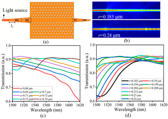 Simulated transmission features of the designed 2D LN-based tapper waveguide integrated with a PhC waveguide: (a) the simulation model employed in this study; (b) the electric field distribution for each r; (c) the impact of a on the transmission efficiency; and (d) the effect of r on transmission efficiency. The transmission efficiency is plotted as a function of the wavelength, demonstrating the waveguide’s ability to guide and transmit light efficiently within the specified a and r.