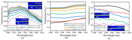 Additionally, we investigate the influence of various taper conditions on waveguide transmission. The simulations are conducted with the following fixed parameters: z at 0.3 μm, a at 0.72 μm, r at 0.24 μm, and tapered waveguide widths of 1 μm and 1.55 μm on either side. The length of the tapered waveguide is set at 5 μm, and m is set at 0.3 μm, with a fixed inclination angle of 70°. Initially, as seen in Figure 5a, the width of the tapered waveguide is varied between 1 μm and 2 μm, and is fixed at 1.55 μm. When is set to 1 μm, the transmission efficiency ranges from 90% to 88%. When is increased to 2 μm, the transmission efficiency decreases, reaching values between 85% and 83%. Furthermore, with fixed at 1 μm, the width of the input part of the tapered waveguide is varied between 0.1 μm and 1.55 μm. The effects of these variations on transmission efficiency are illustrated in Figure 5b. With set at 0.1 μm, the transmission efficiency ranges from 33% to 49%. However, as increases to 1.55 μm, the transmission efficiency improves significantly, reaching values between 81% and 92%. These findings clearly demonstrate that wider tapered waveguides substantially enhance transmission efficiency, highlighting the importance of optimizing the waveguide geometry of high-performance photonic devices.
