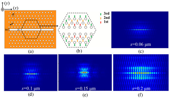 Figure 6c–f present the simulated electric field distributions in the x–y plane for four slot widths: 0.05 µm (c), 0.1 µm (d), 0.15 µm (e), and 0.2 µm (f). The results highlight the strong dependence of the electric field profile on the slot width (s). A narrower s, at 0.06 µm, exhibits intensified field localization within the cavity, owing to stronger light–matter interactions at the slot edges. In contrast, a wider s, at 0.2 µm, reduces field confinement, leading to broader mode profiles and diminished Q-factors. These findings underscore the necessity of precise geometric control in tailoring the optical performance of LN-based PhC cavities, particularly for applications requiring ultrahigh-Q resonances or enhanced nonlinear effects.