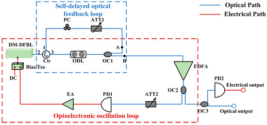 The schematic diagram of the DM-DFBL self-delayed feedback with an optoelectronic oscillation loop is shown in Figure 1. The DM-DFBL self-delayed feedback structure is marked by a blue dashed frame, and the optoelectronic oscillation loop is marked by a red dashed frame. The DM-DFBL self-delayed feedback consists of a DM-DFBL, an optical circulator (Cir), an optical delay line (ODL), an optical coupler (OC1), an attenuator (ATT1), and a polarization controller (PC). The optoelectronic oscillation loop consists of a DM-DFBL, a Cir, an ODL, OC1, an erbium-doped fiber amplifier (EDFA), OC2, ATT2, a photodetector (PD), and an electric amplifier (EA). In this scheme, the nonlinear dynamical state of the DM-DFBL output is mainly controlled by the optical feedback intensity () and the electrical feedback intensity (). In the DM-DFBL self-delayed feedback loop, the is changed by adjusting ATT1. The polarization state of injected light and the internal optical field in DM-DFBL is controlled by the PC. When the polarization of the injected light and the cavity mode are matched, the nonlinear threshold of the DM-DFBL is minimized. In the optoelectronic oscillation loop, the optical signal is converted into an electrical signal through the PD and fed back to modulate the DM-DFBL.