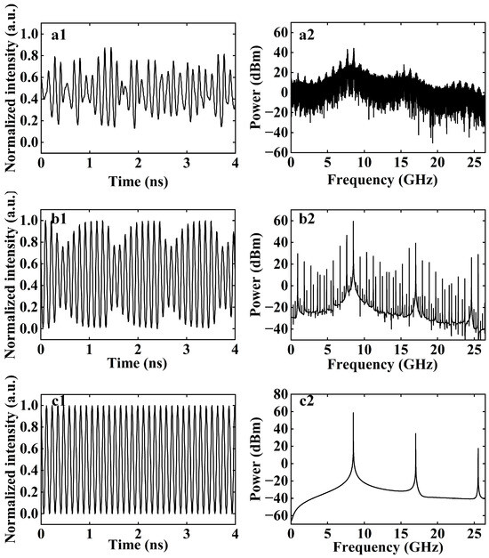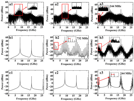 Finally, the output of the DM-DFBL self-delayed feedback is set to the P1 state and then introduced into the optoelectronic oscillation loop. When and , the output of the DM-DFBL is still in the P1 state, as shown in Figure 5(c1,c2). There is no obvious change in the P1 state when compared to the case in the absence of the introduction of the optoelectronic oscillation loop (Figure 2c). It is due to the limitation of the accuracy of the fourth-order Runge–Kutta algorithm in the numerical calculation process. In a subsequent experiment, the enhancement of the P1 state is found to have an obvious effect. When , the oscillation mode with FSR = 244 MHz appears near DC, as shown in Figure 5(c3). Consequently, this is further evidence that the optoelectronic oscillation loop is gradually dominating the output of the laser.