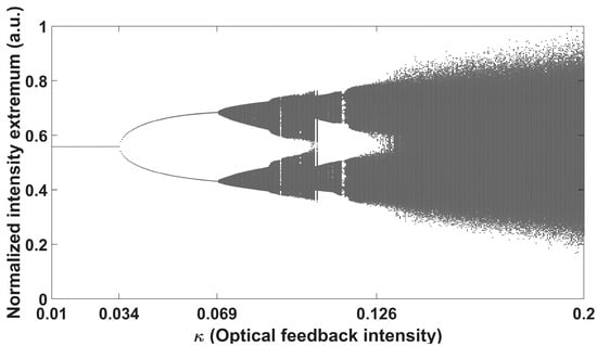 Figure 3 shows the bifurcation diagram of the dynamics states that are generated based on DM-DFBL self-delayed pure optical feedback, with the variation of . When is smaller than 0.034, the feedback light is not enough to interfere with the output of the DM-DFBL; thus, the DM-DFBL is in a steady state. When is more than 0.034, there is a maximum or a minimum at the same position, indicating that the DM-DFBL is in the P1 state. Meanwhile, the intensity of the P1 state is enhanced with the increase of . When is more than 0.069, the feedback light interacts with the cavity mode to induce multiplicative period bifurcations, resulting in multiple extreme points at the same position. It means that DM-DFBL is in the MP state or QP state. There is an increase in the number of extreme points with an increase in . When is more than 0.126, the intense competition between individual modes in the laser can occur, the bifurcations quickly increase, and the periodicity of the DM-DFBL is destroyed. Eventually, the DM-DFBL evolves to the CO state. This evolutionary process is called multiplicative period bifurcation, which is a typical dynamic state evolutionary process.