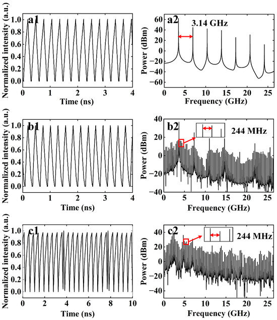 The dynamic behaviors of the optoelectronic oscillation loop are studied, as shown in Figure 4. The optoelectronic oscillation loop can be considered as an OEO, which is a typical feedback system with rich nonlinear dynamic state characteristics. The rich dynamic behavior in the OEO benefits from the high-gain feedback. Figure 4a shows the results for . The time series presents a regular pulse signal, and there is a series of equally spaced frequency components with a frequency interval of 3.14 GHz in the frequency spectrum, i.e., the MFC. The MFC originates from the nonlinearity of the DM-DFBL because the injected electrical signal causes the laser to operate in the nonlinear region. Figure 4b shows the results for ; it is evident that some frequency components with a frequency interval of 244 MHz and relatively low intensity appear between the MFC frequency components in the spectrum. The frequency interval of these components is called the free spectral range (FSR, , where is the velocity of optical, is the effective refractive index of the transmission medium, is the length of the OEO loop). These FSRs originate from the OEO oscillation eigenmodes, which are determined by the length of the OEO loop (corresponding time delay is 4 ns) and the relaxation oscillation time of the DM-DFBL. Nevertheless, the time series maintains regular pulse signals due to the MFC’s dominant influence. Figure 4c shows the results for . The MFC has essentially disappeared, and a set of FSRs with a frequency interval of 244 MHz is observed in the frequency spectrum. It is named the full-frequency oscillation from a self-locking state of the fundamental frequency [19]. The regular pulse signal appears with burrs in the time series due to the spectrum components of the MFC still exists, as shown in Figure 4(c1,c2). Moreover, due to the well-defined phase relationships among spectral components in pulse signals, the optoelectronic oscillation loop contributes to enhanced signal stability in experimental systems.
