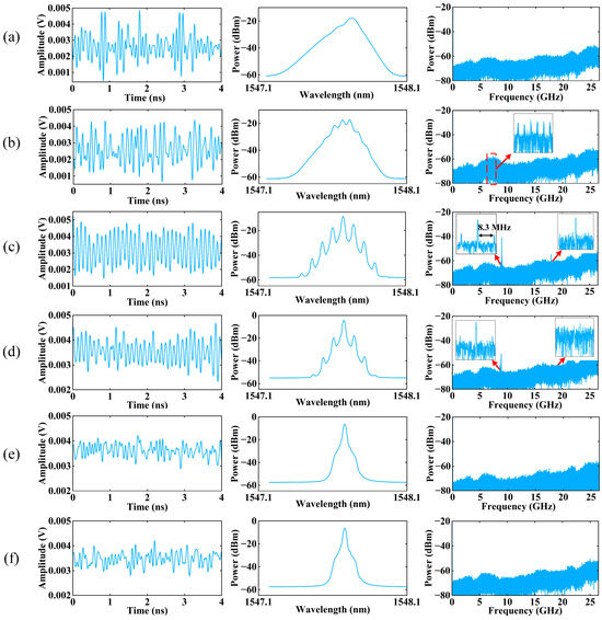 When , the time series are irregular waveforms with randomly varying peaks, as shown in Figure 6a. Compared to the optical spectrum of free output (Figure 6f), the single-mode feature of the output is broken, and the optical spectrum is broadened, and the frequency spectrum is a flat continuous spectrum. These results indicate that the laser is in a CO state. When , although the time series are still chaotic, the intervals between each peak seem to exhibit periodicity, as shown in Figure 6b. The optical spectrum narrows gradually and presents optical sidebands compared to the CO state. The corresponding frequency spectrum also narrows with the energy gradually concentrating, and a set of oscillatory envelopes appear at the concentration, as shown in the inset in Figure 6b. It means that the laser is in the QP state. When , the time series is not a strictly sinusoidal signal; it fluctuates in amplitude, as shown in Figure 6c. This is due to the fact that the P1 oscillation is formed by the dynamic competition between a regeneration mode and a cavity mode after redshift. The oscillation is more sensitive to external disturbances, resulting in an unstable generated P1 signal. Therefore, the amplitude of the sinusoidal has certain fluctuations while possessing a strict periodicity. The optical spectrum is centered on the cavity mode of the DM-DFBL with multiple optical sidebands of fixed wavelength differences. This is a typical optical spectrum of a P1 oscillation. The frequency spectrum has a high-power oscillation mode with a frequency of approximately 8.9 GHz, and an oscillation mode of lower power is also found at 17.8 GHz, which is a higher-order mode of the P1 oscillation (a frequency-doubled signal). These results indicate that the laser is in the P1 state. When , the amplitude of the time series, optical spectrum, and frequency spectrum is all weakened, as shown in Figure 6d. In addition, the number of optical sidebands decreases in the optical spectrum, and higher-order modes disappear in the frequency spectrum, but the general trend is consistent with the P1 state. These results indicate that the laser is in the weak P1 state. When , the corresponding time series, optical spectrum, frequency spectrum, and free outputs of the DM-DFBL are almost consistent, as shown in Figure 6e,f. This means that the injected light almost has no influence on the output of the laser.