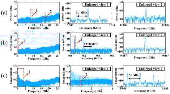 The optoelectronic oscillation loop is in operates alone (disconnect point A and connect point B), as shown in Figure 1. In the experiment, the electrical feedback intensity () is expressed in terms of the power injected into PD1. When , the optical signal is converted into an electrical signal with weak intensity. However, the inherent high gain of the EA amplifies even weak electrical signals beyond the oscillation threshold, initiating sustained oscillations. In this experiment, the non-flat open-loop response of the OEO (manifested through frequency-dependent EA gain variations) creates preferential amplification conditions, and the shorter fiber length in the OEO loop results in an extended FSR of 3.1 MHz, thus partially suppressing conventional multi-mode oscillations. Under these combined effects, a specific oscillatory mode coinciding with the EA’s optimal response frequency becomes dominant [19]. Through iterative feedback modulation, this selected mode undergoes progressive enhancement, ultimately evolving into a stabilized single-mode microwave signal as shown in Enlarged view 1 of Figure 7a. The frequency spectrum profile confirms the OEO’s operation in the fundamental P1 oscillation regime. Additionally, the system simultaneously generates the frequency-doubled harmonic component observable in the Enlarged view 2 of Figure 7a, indicative of nonlinear interactions within the oscillation dynamics. It is noteworthy that the P1 does not appear since the open-loop response of the OEO is flat in the numerical calculations. When , there is a series of equally spaced frequency components with a frequency interval of 123.8 MHz, i.e., the MFC, as shown in Figure 7b. In the Enlarged view 2 of Figure 7b, there is no obvious FSR, indicating that the system has not yet reached the oscillation threshold. In fact, the intensity of these MFC’s frequency components is enhanced and the number of frequency components is increased when they can get more gain. When , there is a series of FSRs with a frequency interval of 3.1 MHz generated, as shown in Figure 7c. It means that the loop starts to oscillate due to thermal noise.