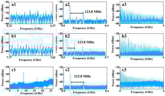 Next, the output of the DM-DFBL self-delayed feedback is set to the QP state and then introduced into the optoelectronic oscillation loop. In the case of , the dynamic state of the DM-DFBL is transferred from the original QP (Figure 2b) to the P1 state, as shown in Figure 5(b1). The phenomenon is caused by the vernier caliper effect of the two oscillating modes of the self-delayed feedback loop and the optoelectronic oscillation loop. The optoelectronic oscillation loop can drive the QP state into a periodic state, owing to the inherent susceptibility of QP states to external disturbances. When , a number of frequency components appear in the frequency spectrum, and the corresponding FSR is about 732 MHz (3 times the FSR of the OEO), which is also the MFC, as shown in Figure 5(b2). When , the periodic states in the frequency spectrum are destroyed, and the output of the laser develops towards the eigenoscillation of the OEO, as shown in Figure 5(b3). This means that the optoelectronic oscillation loop is gradually dominating the output of the laser.