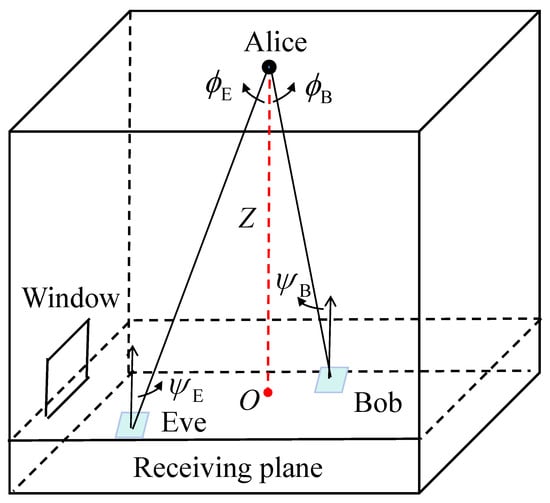 Without loss of generality, it can be assumed that the normal direction of the PD is perpendicular to the receiving plane, so , Z is the vertical distance between the receiver plane and the ceiling, while ()) represents the distance from Bob or Eve to point O. Then, we can rewrite the channel gain as