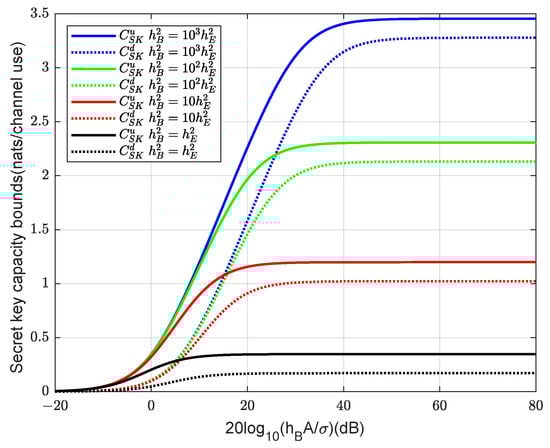 where is about 2.3625. From this expression, we find that the lower bound of the secret key capacity is bigger than that of the secrecy capacity in the same situation [5] (Equation (10)). In particular, we can see that even if Bob’s channel is worse than that of Eve, a nonzero secret key rate can still be achieved. This means that we can secure message by using secret key agreement in this situation, because the classical eavesdropping encoding methods do not work.