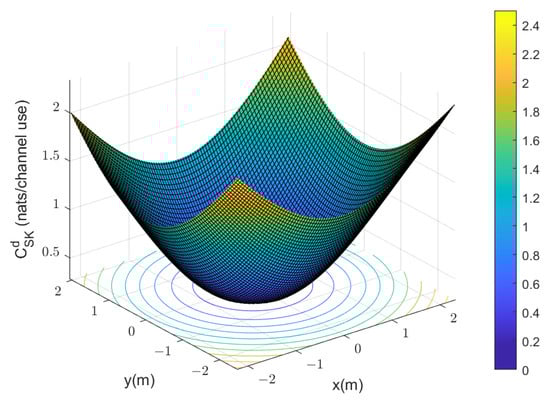 Figure 3 presents the achievable secret key rate (see (13)) against the location of the eavesdropper on the receiving plane. Bob is located at the center of the receiving plane, the optical power of the LED is 1 W, and the average electrical noise power is dBm. The figure demonstrates several interesting phenomena. First, the further away Eve is from Bob, the larger the achievable secret key rate is, especially when Eve moves into the corner, when it reaches to a maximum secret key rate of 2.44 nats per channel use. Furthermore, even in the worst-case scenario where Eve occupies the central position (with channel conditions matching Bob’s), it still yields a positive achievable secret key rate of 0.17 nats per channel use as theoretically anticipated (see (13)), which demonstrates the robustness of the secret key scheme.