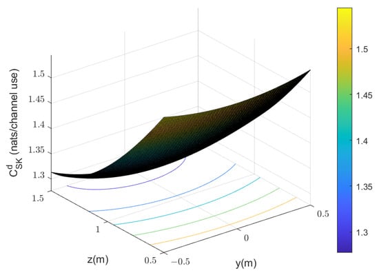Figure 4 presents the distribution of the achievable secret key rate versus Eve’s location in relation to the window, while Bob is still located at . As illustrated in Figure 4, we can achieve a secret key rate of at least 1.28 nats for every channel use. In addition, if the Z-axis coordinate of Eve in relation to the window exceeds 1.6 m, due to the limitation of FOV, Eve cannot receive the LED signals and the secret key rate can reach to communication rate.