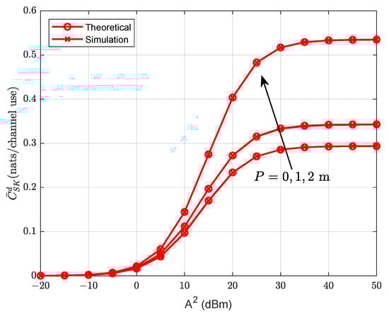 Figure 5 presents the average secret key capacity versus the square of the amplitude constraint for different values of P (P is the radius of the the protected zone), when m and dBm. We obtain the simulation results by running Monte-Carlo experiments. As shown in Figure 5, first increases and then tends to stabilize with the increase in . Moreover, as the radius P of the protected zone increases, the average secret key capacity increases dramatically; this is because the equivalent distance from Eve to Alice is further than from Bob to Alice. Therefore, we can conclude that introducing a protected zone is an effective transmission strategy to improve secret key performance. Of course, we need to have a tradeoff between the secrecy performance and the complexity of the systems in the actual system design.