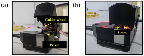 Here, we use a device called a clip-on coupler to emulate fiber eavesdropping. Before the experiment, we use a fiber-stripping plier to strip the jacket, strength member, and buffer of the fiber patch cord until the coating layer is exposed. However, to completely remove those protective layers, we need to cut the fiber and then reconnect it with a fiber fusion splicer. Regarding actual eavesdroppers, they may employ more efficient fiber-stripping techniques, including automated mechanical tools, chemical corrosion, or thermal methods (e.g., heating and melting) without penetrating or cutting the fiber. When the coating layer is exposed, we bend it and put it into the guide wheel of the clip-on coupler, as shown in Figure 1a. When the clip-on coupler is closed, the optical signal leaks at the bent part and is collected by the prism of the clip-on coupler, as shown in Figure 1b. The prism could improve the coupling efficiency. The bending radius caused by the clip-on coupler is about 2.5 mm.