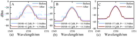 Here, we first measure the optical power, OSNR, and optical spectrum at three positions before and after eavesdropping. The monitoring positions are shown as the orange dots. The results are shown in Figure 4. At positions A and B, fiber eavesdropping causes approximately 3.5 dB of optical power loss, and the optical spectrum shifts downward overall. However, the OSNR remains unchanged. This is because the power of the modulated signal and noise reduce simultaneously. However, at position C (after EDFA2), the optical power and OSNR loss are approximately 1.5 dB and 2.8 dB, respectively. In Figure 4c, the spectrum outside the signal range is slightly elevated. This phenomenon indicates the power of amplified spontaneous emission (ASE) noise is increased slightly. Next, we measure the EVM of received QPSK signals as a function of OSNR1, i.e., the OSNR before eavesdropping. The result is shown as Figure 5a. Figure 5b presents the relationship between OSNR2, i.e., the OSNR after eavesdropping, and OSNR1. It can be observed that OSNR2 decreases compared to OSNR1 and the signal quality deteriorates.