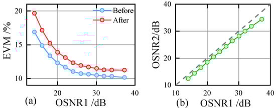 (a) EVM vs. OSNR1; (b) OSNR2 vs. OSNR1.
