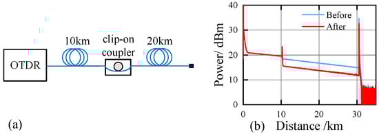 Moreover, we also measure the OTDR curve of a 30 km SSMF before and after eavesdropping, as shown in Figure 6a. The result is shown in Figure 6b. It is evident that the fiber eavesdropping is located at approximately 10 km. The backscatter power decreases after the fiber eavesdropping position, and a small reflection peak appears at the eavesdropping point.
