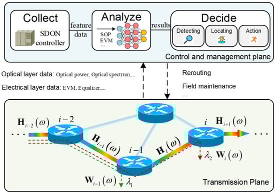 - Decide: Finally, the management plane makes decisions based on the judgments provided by the data center. For example, when a certain link is determined to be eavesdropped, network administrators can reroute the transmission path [28], dispatch maintenance personnel to conduct on-site inspections [29], and utilize an OTDR to precisely locate the fiber eavesdropping.