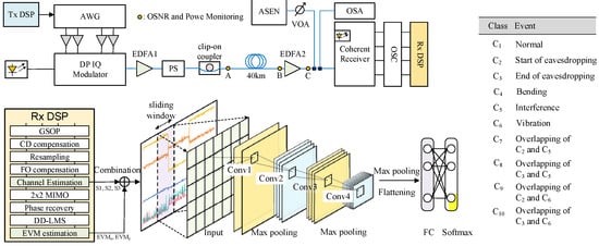 In this system, the transmission link consists of a 40 km SSMF span and an EDFA. Before transmission, a polarization controller (PC) is used to randomize the initial SOP. An amplified spontaneous emission noise (ASEN) source and a variable optical attenuator (VOA) are used to adjust the receiver OSNR. Ten events are simulated on the fiber link, namely: normal, fiber eavesdropping start and end, vibration, interference, and the overlap of fiber eavesdropping with interference or vibration. The corresponding class labels are shown in Figure 8. Here, the start and end of the fiber eavesdropping correspond to the closing and opening of the clip-on coupler. The vibration of fiber is caused by a fascia gun with the frequency of ~60 Hz, aiming to emulate the harmful vibration from external instruments like excavators. Interference is caused by PC, which disturbs SOP with the speed of ~65 rad/s. The interference is designed to emulate rapid SOP changes caused by external environment, such as wind and lightning.