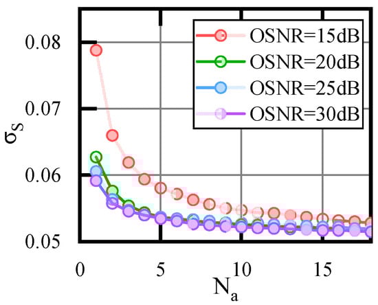 In the optical back-to-back scenario, the as a function of under different OSNR is shown as Figure 9. As we can see, the decreases with the increase of OSNR, which indicates that the ASE noise would affect the precision of estimated SOP. In addition, decreases with the increase in and tends toward to a constant. Therefore, increasing the number of transfer functions used for averaging could increase the precision of estimated SOP. However, increasing the number of frames captured will cause the reduction in the sampling rate of the OSC. To balance the sampling rate and the precision of the SOP, we set to 2 during data collection. Under these conditions, the OSC’s storage depth is 16 kSa/time, while the corresponding sampling frequency is approximately 3 Hz.