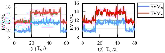 At the receiver (Rx) side, the OSNR is measured by an optical spectrum analyzer (OSA). The coherent receiver consists of a polarization- and phase-diverse 90° optical hybrid, four balanced photodetectors, and four trans-impedance amplifiers. The four received electrical signals are sampled and digitized by an 80 GSa/s oscilloscope (OSC). The OSC is set to operate in automatic sampling mode, which can capture and save the received signals. The sampling frequency is related to the storage depth of OSC. The captured signals are then processed by offline Rx-DSP, as shown in Figure 8. The Rx-DSP includes the Gram–Schmidt orthogonalization procedure (GSOP) and frequency–domain CD compensation. After resampling to 2 samples per symbol, the CAZAC sequence is used for frequency offset (FO) compensation and channel estimation [30]. In this step, the 2 × 2 frequency domain response of the DP fiber channel is obtained, which is then used to estimate Stokes parameters according to Equation (9) and update the taps of the 2 × 2 frequency domain MIMO filter. The MIMO filter tracks SOP rotation and compensates for polarization mode dispersion compensation. Following the V-V phase recovery algorithm, a T-spaced post decision-directed least mean square (DD-LMS) equalizer is used to compensate for residual inter-symbol interference and device penalty. Finally, the EVM of the recovered QPSK signals in both polarizations is estimated.