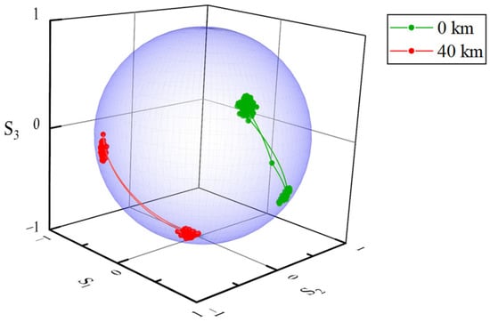 Then, we investigate the relationship between eavesdropping distance and estimated parameters. When the clip-on coupler is placed at 0 km and 40 km from EDFA1, the estimated EVM and SOP under eavesdropping are shown in Figure 10 and Figure 11, where is the sampling time of OSC. As can be seen, the degree of EVM increase is basically consistent, which is because the optical power loss caused by the clip-on coupler is fixed regardless of eavesdropping distance. For SOP, although the Stokes parameters are not completely identical, the characteristics of instantaneously jumping all have been recorded in Figure 11a,b. If we plot the Stokes parameters for 0 km and 40 km on the Poincaré sphere (Figure 12), it can be observed that the degree of Stokes parameters change in the Poincaré sphere is basically consistent. Therefore, the eavesdropping distance only affects the rotation SOP rotation of fiber link but does not affect the characteristics of eavesdropping. Moreover, for eavesdroppers, the closer they are to the EDFA launch point, the higher the power of the eavesdropped signal will be. Based on the above analysis and for the convenience of the experiment, we fix the clip-on coupler at 0 km from EDFA1 when collecting data. The estimated SOP and EVM example of 10 events can be found in the Supplementary Materials.
