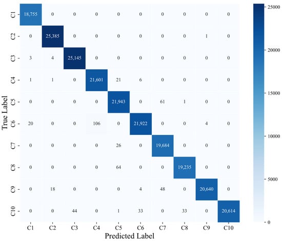 After collecting data and training the CNN model, the confusion matrix of the test set is obtained, as shown in Figure 13. To assess the effectiveness of the trained CNN model, we conducted a comprehensive performance evaluation based on standard classification metrics as detailed in Table 1, including overall accuracy, precision, recall, and F1-score for each class. The overall accuracy of the entire test set reached 0.9977, indicating high discriminative capability. However, the ASE noise in optical communication system, affects the performance of trained models. For the test set under 15 dB OSNR conditions, the classification accuracy is 0.9974, showing a 0.23% relative decrease compared to the overall accuracy. For the test set under 25 dB or 30 dB OSNR conditions, the accuracy increases slightly. In addition, the results also show that the trained model performs well in detecting each event. Under normal situations (C1), the recall rate can reach 100% with no missed detections (i.e., false negatives). The precision of C1 is 0.9987, with the major misclassifications (i.e., false positives) arising from vibration (C6). This is because sometimes the vibration intensity is not large enough for the change in SOP to be obvious. For fiber eavesdropping start and end (C2 and C3), the recall nearly approaches 1.0000, with only a few instances of missed detections. The major misclassifications of C2 and C3 are from C9 and C10, respectively, i.e., the overlapping of vibration and eavesdropping start or end. The misclassifications and missed detections for fiber bending (C4) primarily involve interference (C5) and vibrations (C6), but the model demonstrates strong discriminative capability between fiber bending and fiber eavesdropping. For the interference (C5), the misclassifications are mostly from the overlapping of interference and fiber eavesdropping start (C7), which is mainly because the interference could affect the transformance performance. However, the major missed detections of interference (C5) arise from the C7 and C8, i.e., the overlapping of interference and eavesdropping start or end, which indicates that fiber eavesdropping in an interference environment may be difficult to detect. For the vibration (C6), it is most easily classified as fiber bending (C4), as the duration of C6 fails to occupy a sufficiently large proportion of the sliding window length. As for the overlapping-type events (C7, C8, C9, and C10), they are easily confused with a single-type event.